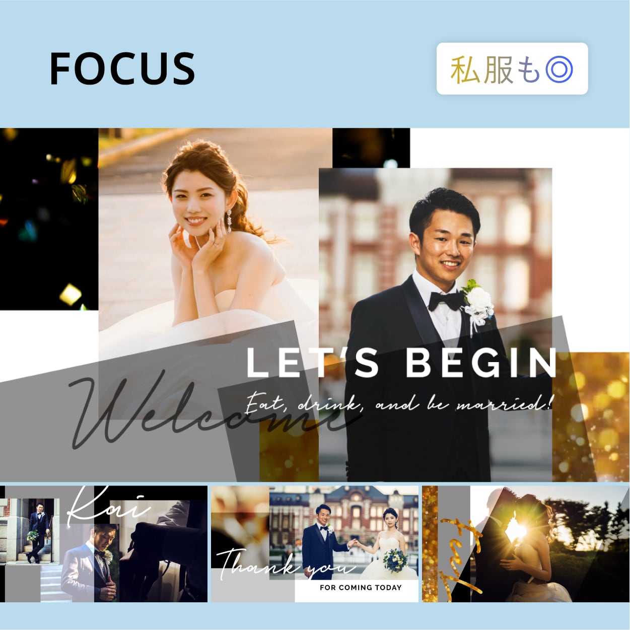 メッセージ等のテキストも少なくし、前撮り写真が際立つムービー演出です。